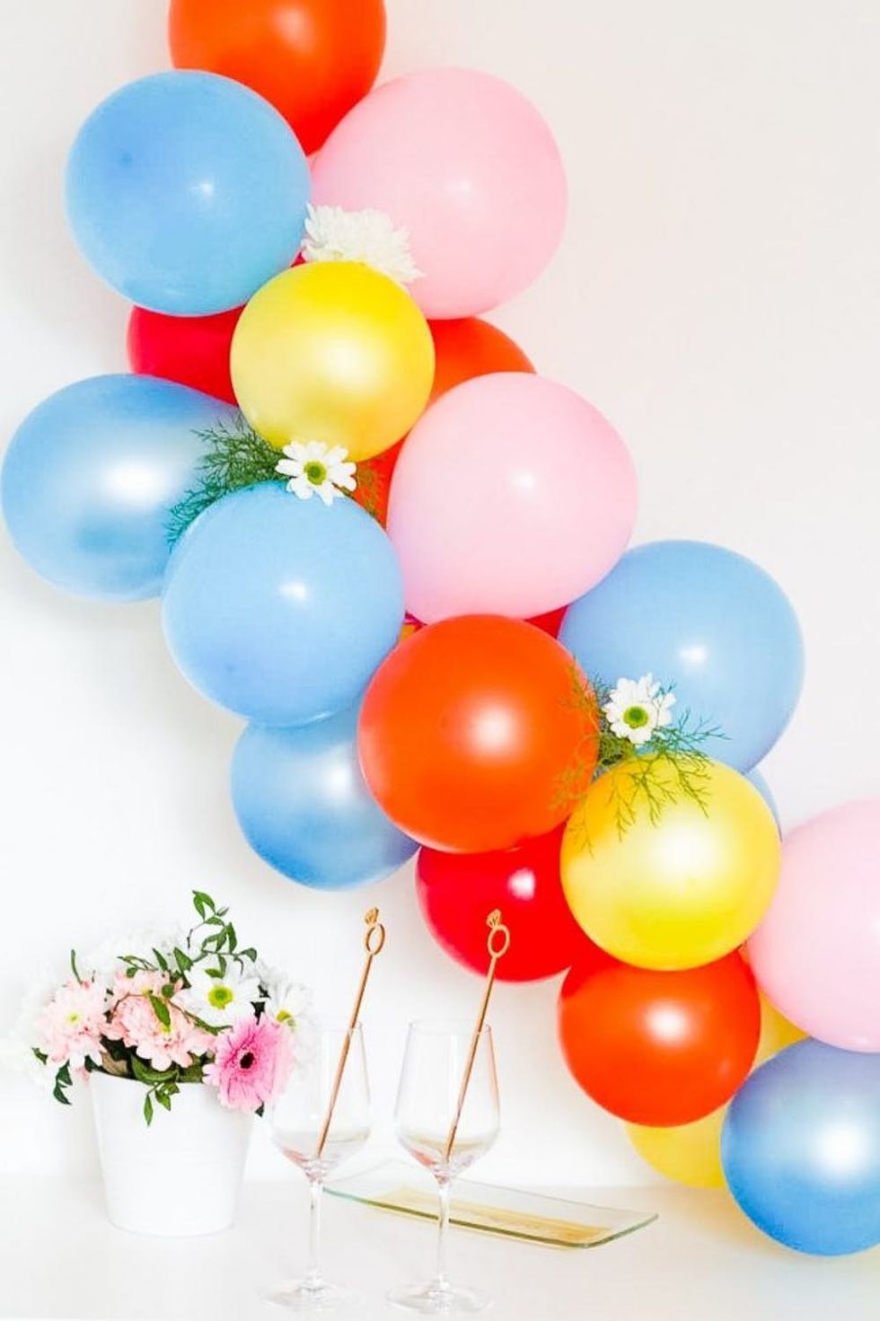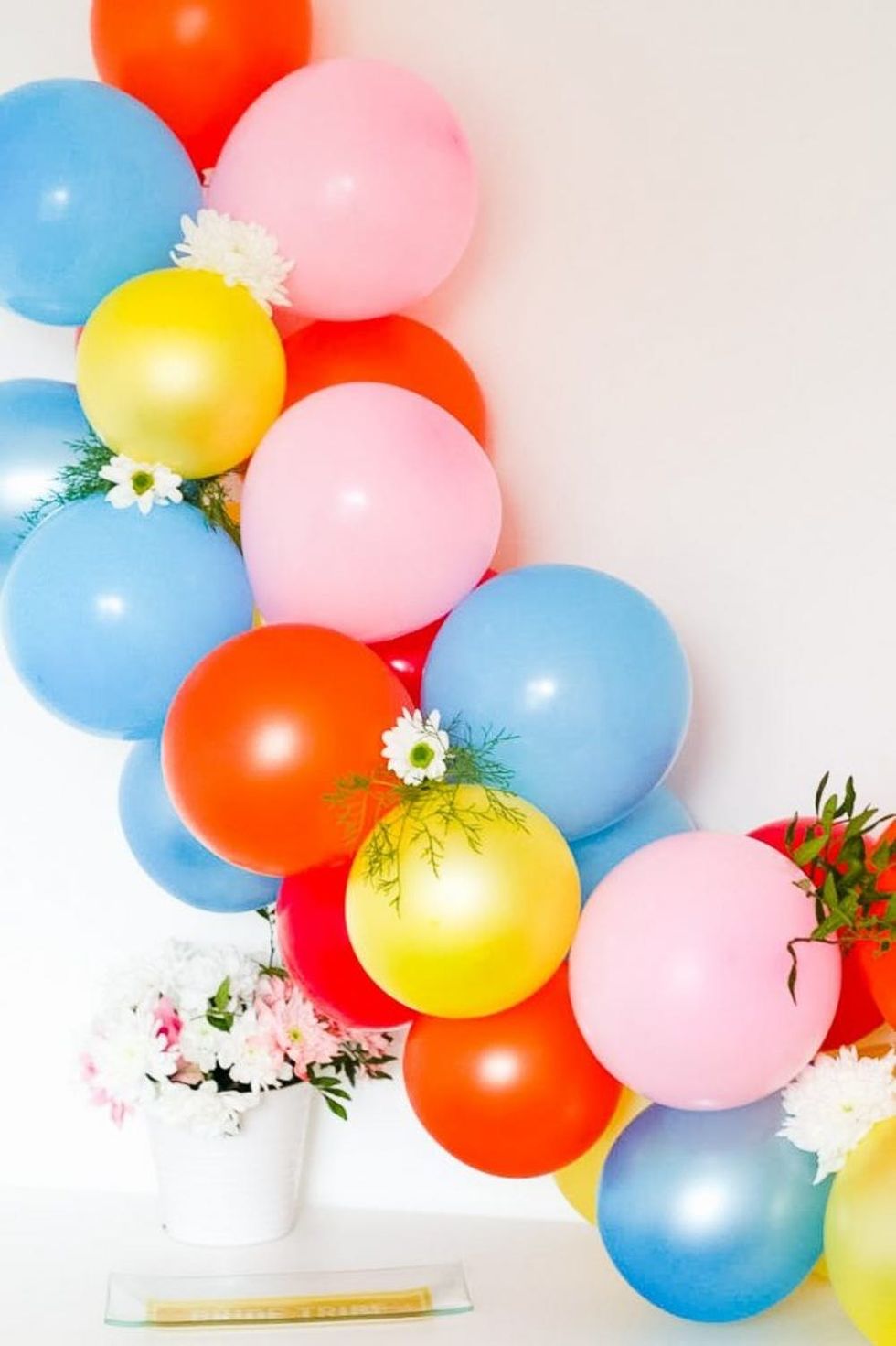 6. Once you’re finished with the balloons, stick flowers and foliage in the gaps between the balloons and tape them in place. These additions not only bring bonus charm, but are a great way to cover up any string that’s still visible.