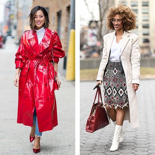 In the Trenches: When in doubt, just turn to influencer Danielle Bernstein for inspiration. Here, she transforms a lightweight trench into a dress by closing it up with a belt. The sneakers and plaid pants tone down the look, making it comfortable enough for running around on the weekend, but still dressed-up enough for an impromptu Saturday afternoon catch-up with your girlfriends. (Photo via Matthew Sperzel/Getty)