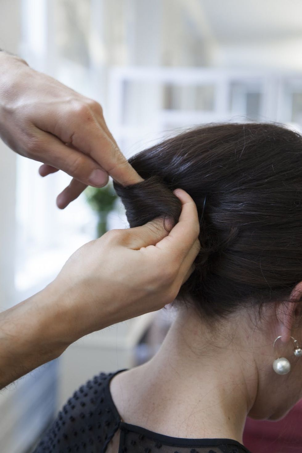4. On the other side, wrap the hair, pinning in place as you go. “Make a U-turn with the pin, where you push in and pull back,” he says.
