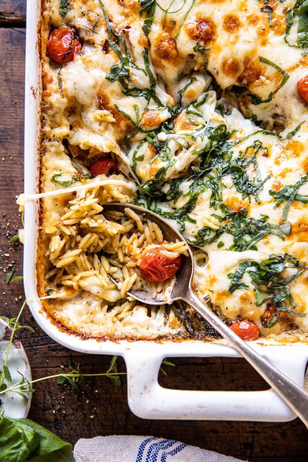 Venture into a flavor-packed journey with the delightful One-Pan Caprese Pesto Orzo Bake. Experience the harmonious blend of juicy tomatoes, creamy mozzarella, and fragrant basil as they come together in a comforting, oven-baked dish. With each bite, savor the rich flavors and textures of the cheesy orzo bathed in a luscious pesto sauce, creating a truly satisfying meal that will leave you craving more. (via Half-Baked Harvest)