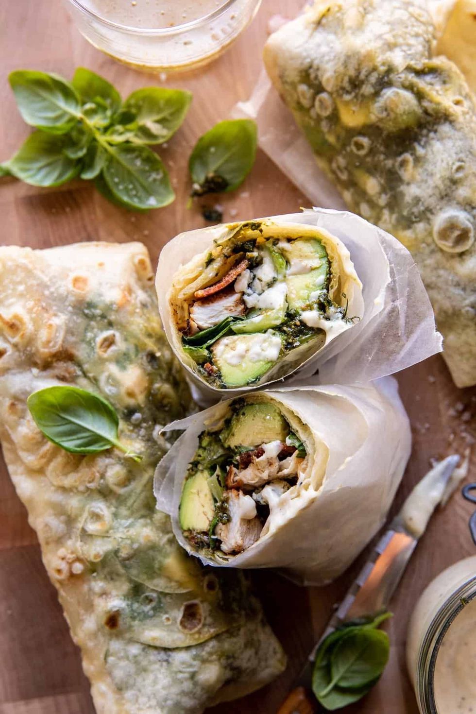 Indulge in the combination of tender, flavorful chicken, creamy avocado, crispy bacon, and vibrant greens, all wrapped in a soft tortilla. This recipe offers a refreshing and satisfying light lunch or dinner option, perfect for warm weather. With each bite, experience the delightful medley of textures and the burst of flavors from the zesty pesto and the smoky bacon. (via Half-Baked Harvest)