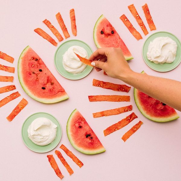 Sakara introduced us to the wonders of watermelon jerky, and as much as we lurrrrve it, $13 for a package isn’t always in our budget (unhappy face). If you’ve never had watermelon jerky before, think of it more like dried mango in terms of flavor and texture. To make it yourself, thinly slice watermelon, spritz it with a little lemon or lime juice to prevent oxidation, and dehydrate it slowly until it turns into fruit leather. If you want to take things up a notch, dip it in homemade vanilla bean whipped cream. Take a look at the easy method of dehydrating watermelon below: