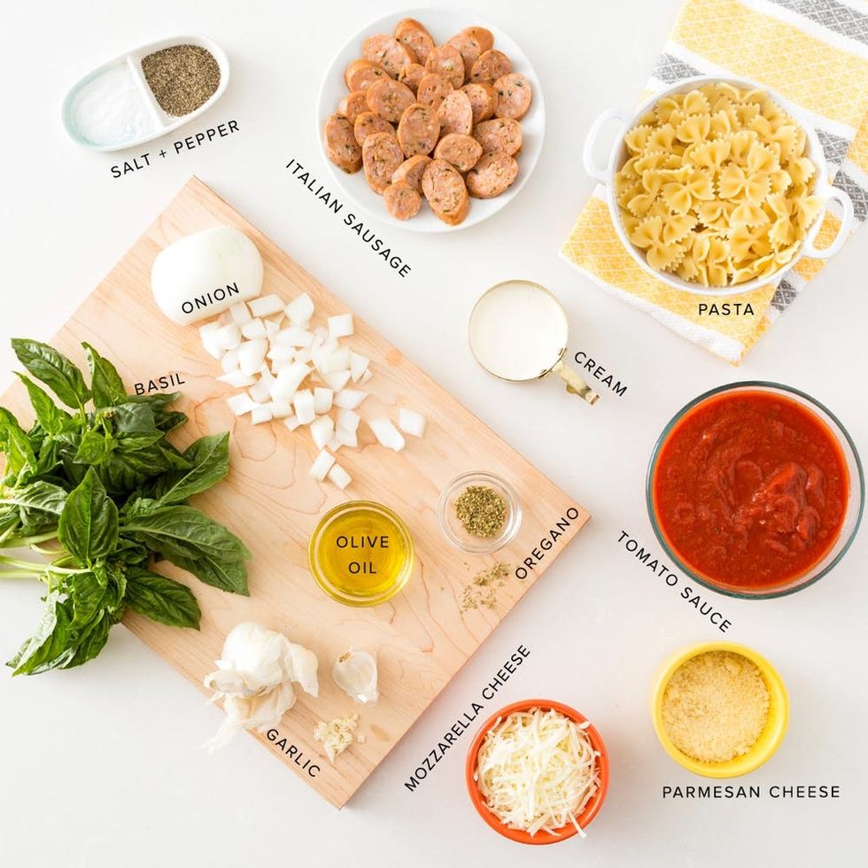 Cheese so good! This is the cheesy pasta bake of your dreams. First up, sauté your onions, garlic, sausage, and spices. Add in the cooked pasta, mozzarella cheese, and fresh-cut basil for a little extra flavor. Lastly, before throwing in the oven, add a nice top layer of cheese. It’s really up to YOU how much you want to put on. Just make sure you let it bubble up and get toasty before taking your bake out of the oven.