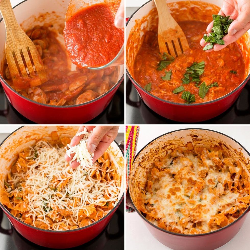 - Stir in the tomato sauce and let simmer for about 5 minutes. Mix in 1/2 cup of mozzarella cheese, half of the fresh basil, and the cooked pasta.