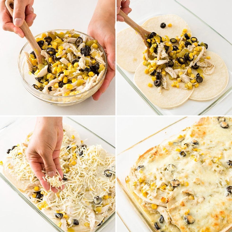 - Place 4 tortillas on the bottom of a greased 9×13-inch baking dish.