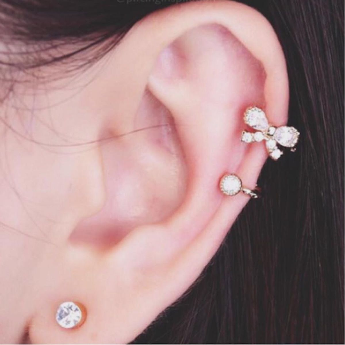 4. Diamond Tragus and Triple Conch Piercings With Pearls: What could be more ladylike than diamonds and pearls? You can’t go wrong with this timeless pairing that will forever be in style.