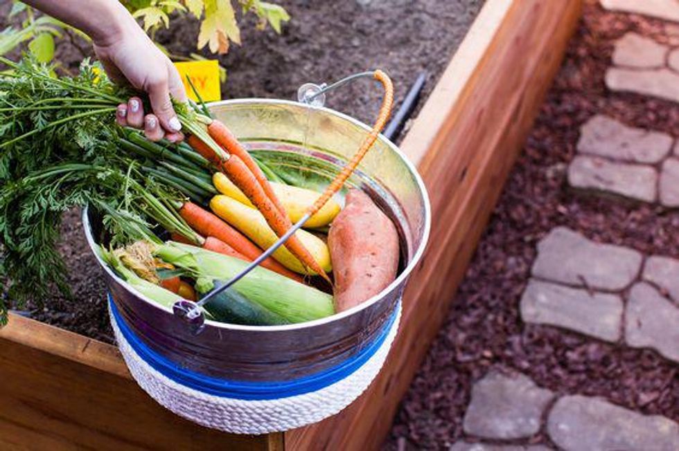 Instead of a basket for gathering, we went for a more durable bucket. This way, you can even spray herbs and what not to keep them fresh if you can't put them right in the fridge.