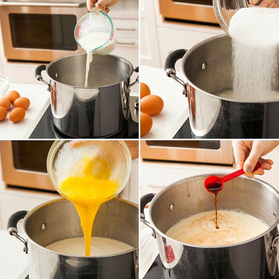 To start, separate your eggs. In a large saucepan, combine milk, half and half, sugar, egg yolks, and vanilla. Cook over low heat until warm, stirring continuously.