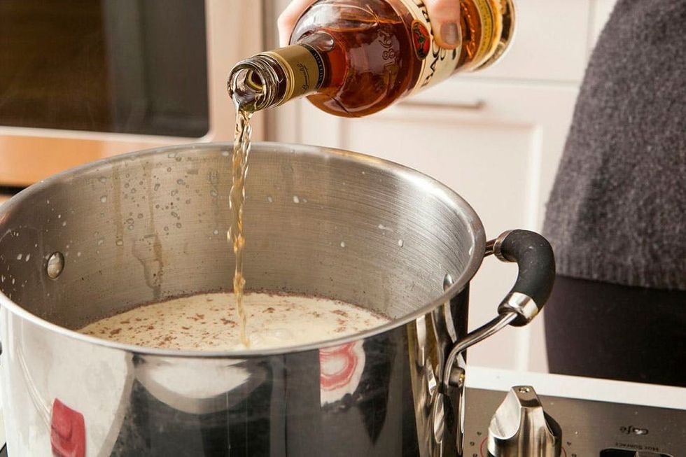 1. Separate eggs. In a large saucepan, combine milk, half and half, sugar, egg yolks, and vanilla. Cook over low heat until warm, stirring continuously. Add rum, to taste.