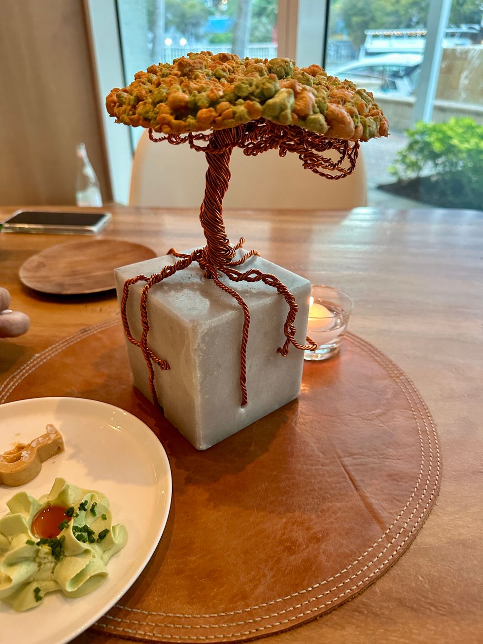 We revved up for the main dishes with the Tree of Life bread service, inspired by the chef’s trip to the Amazon. This flatbread, which is made to look like a tree, is made with yucca, mozzarella, paprika and basil, served with a toasted butter that had a subtle sweetness and a basil an oregano and cilantro sour cream that I could happily eat by the gallon. Call me basic, but that bread was another star of the meal for me.