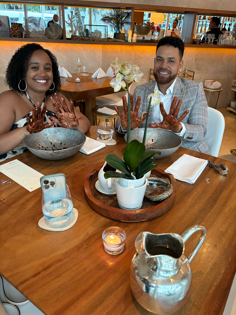For the next step in this culinary journey, be sure to have your cameras ready. It’s the signature “Chocotherapy.” During this spa-like moment, our server poured warm chocolate ganache over our hands, encouraging us to rub it between our fingers before adding some sugar and coffee grinds to help exfoliate. Then we got to lick it all off.
