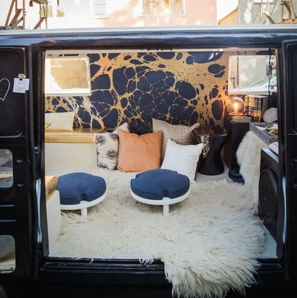 She used layering and lots of chrome and gold to glam it up a bit — sort of reminiscent of the inside of a jewelry box. The furniture inside the van is very low and either round or square, perfect for lounging. She created a ’70s vibe, complete with luscious fur rugs, satiny pillows and comfy ottomans. Now isn’t this better than those dingy vans of yore?