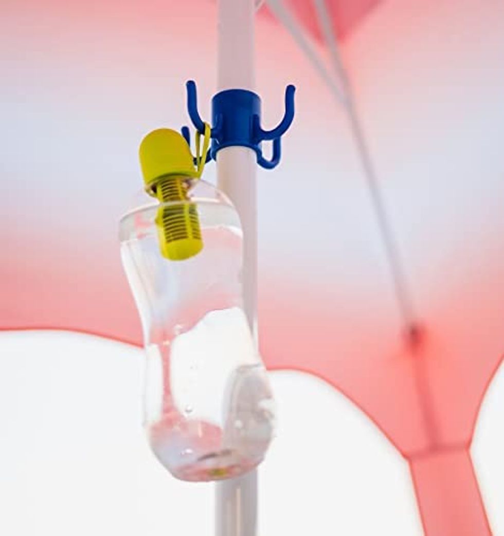 This umbrella hook is one of those items that is better to have and not need than need and not have. It has a twist-clamp that holds strong around most poles, providing four hooks to keep everything from bags you don't want to get sandy to heavy wet towels that need to dry.