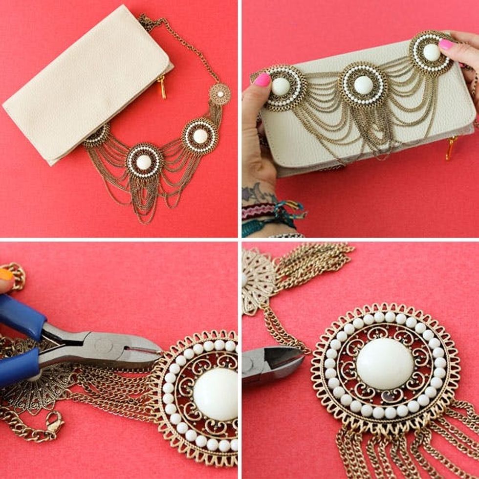 We’ll start with a clutch that ended up looking pretty vintage. Lay out the necklace how you’d like it to be on your clutch. Use needle nose pliers to detach chain or any additional beads or pieces from the necklace.