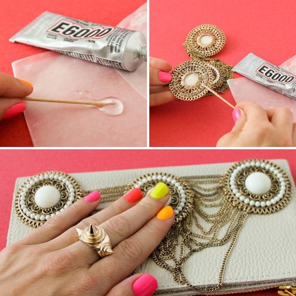 Use a toothpick to apply E-6000 glue to the back of your necklace and press onto the clutch. Let dry for at least an hour before using, but best to let it dry overnight to really adhere.
