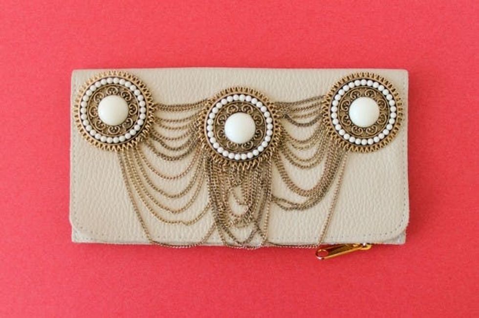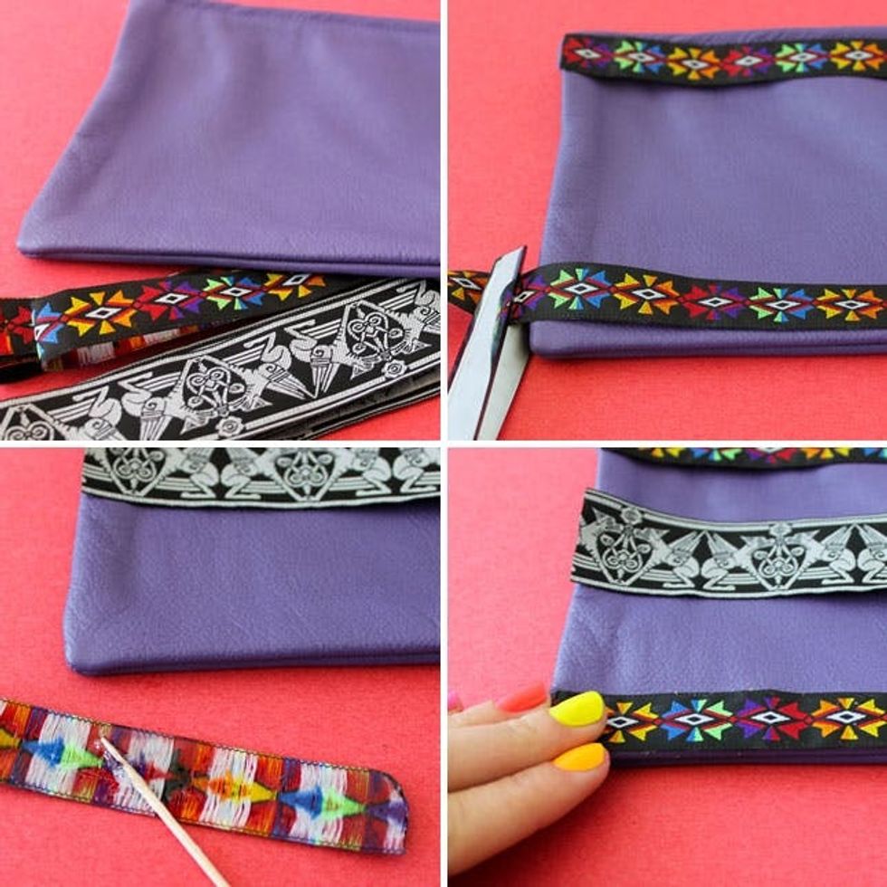 Yesterday we scoured the web for all the creative ways our fellow makers and shakers create their own classy clutches, and now we’re here to show you a couple tricks of our own. Read on to see how we turned a couple basic zip clutches into statement bags using nothing but fabric trim, statement necklaces, and glue!