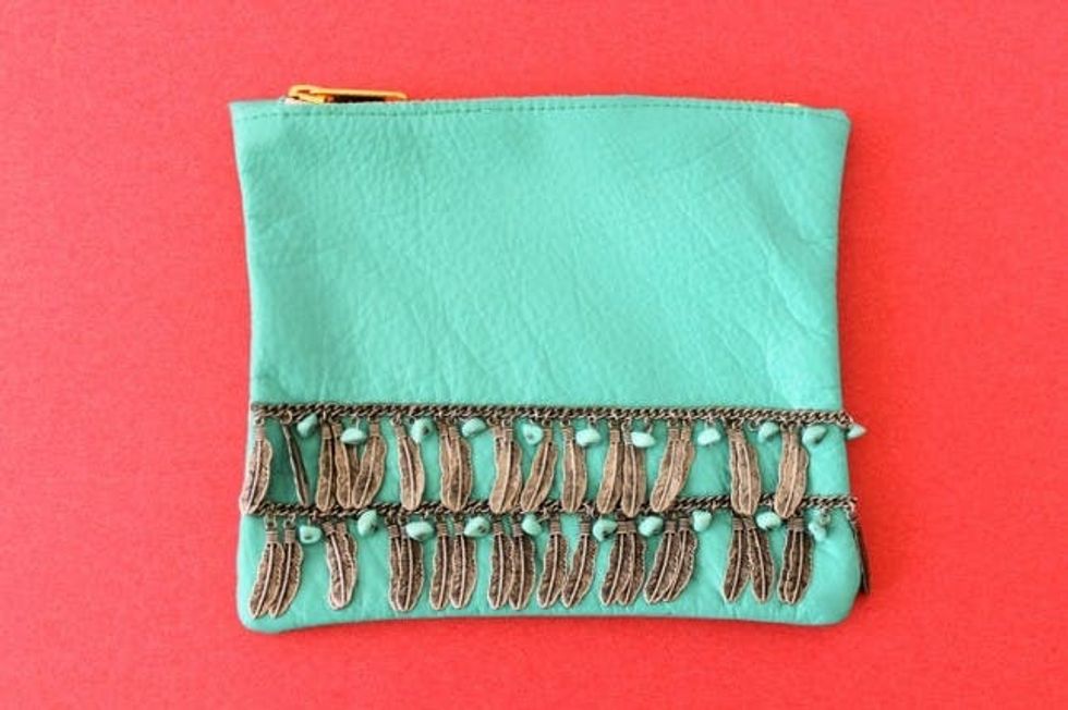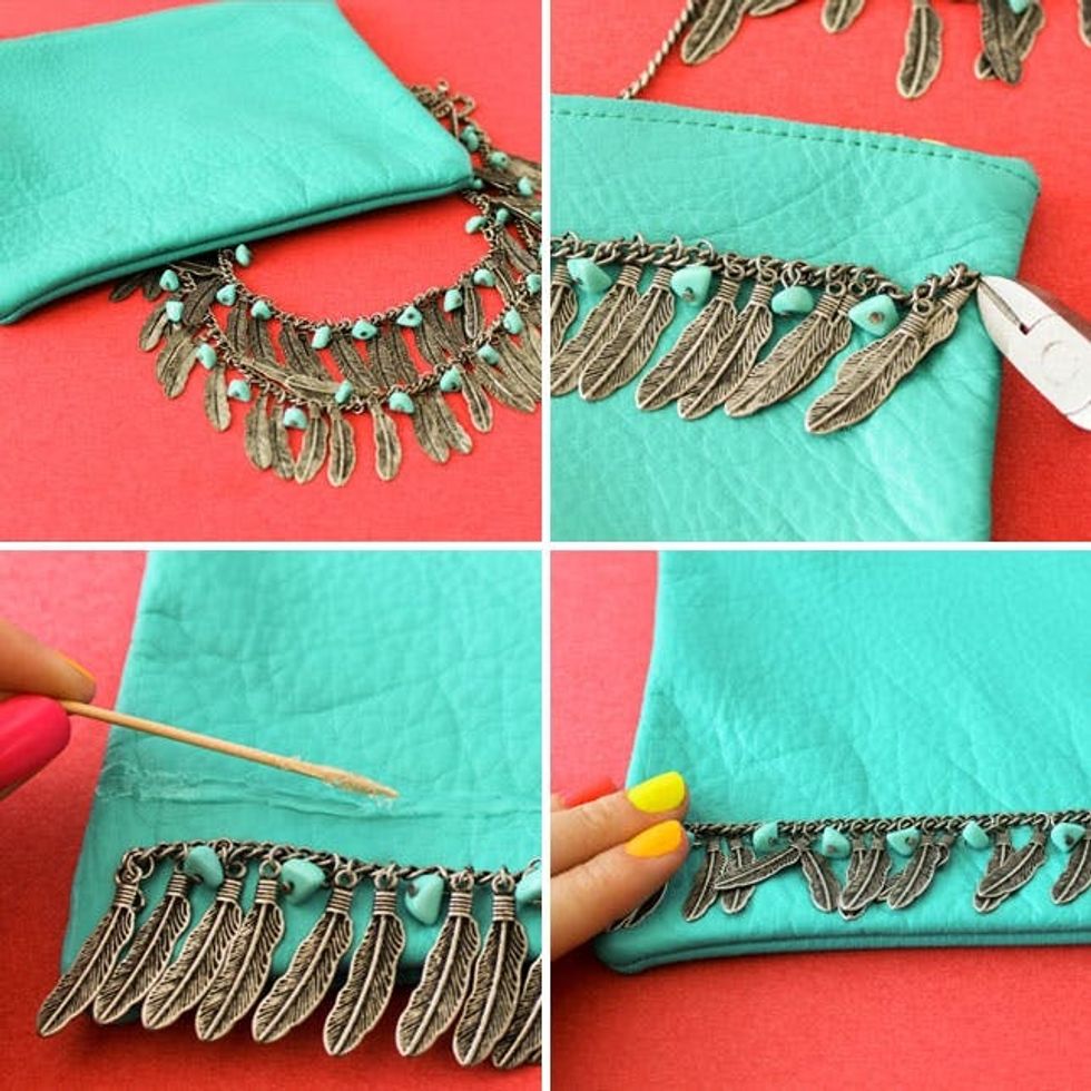 Next, we added a silver feathery necklace to a turquoise clutch. Create two rows of feathers by using needle nose pliers to cut the right length stripe. Then use a toothpick to glue.