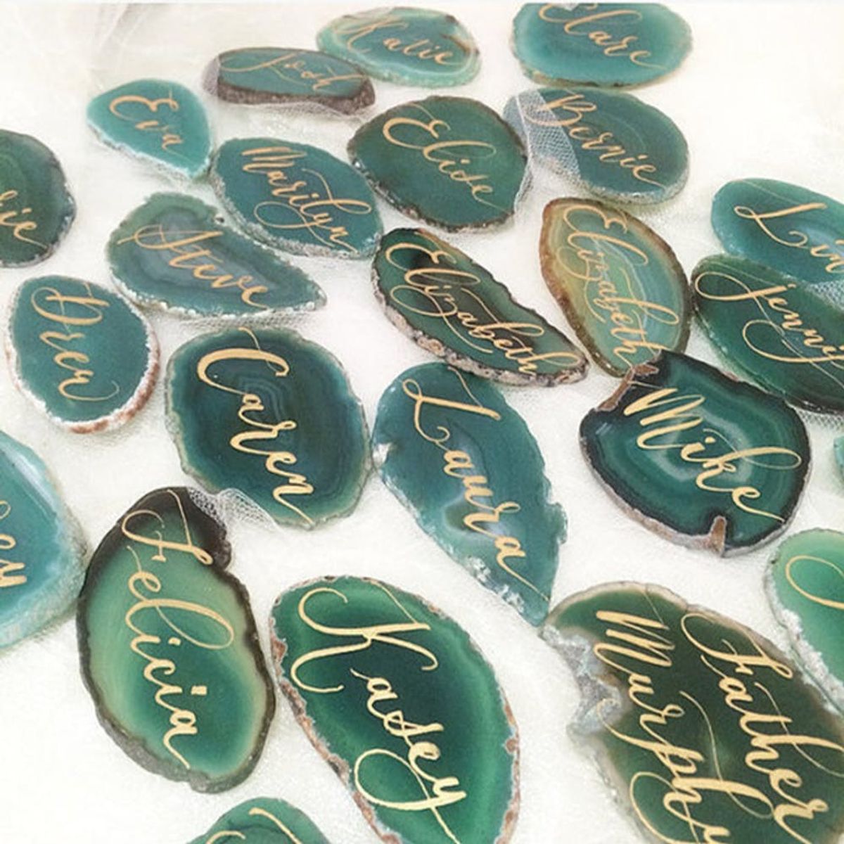 7. In Loft Calligraphy Agate Slice Place Cards ($6 each): Customize your seating chart with these lovely agate place cards. Bonus: They’re only a click away on Etsy! (via In Loft Calligraphy)