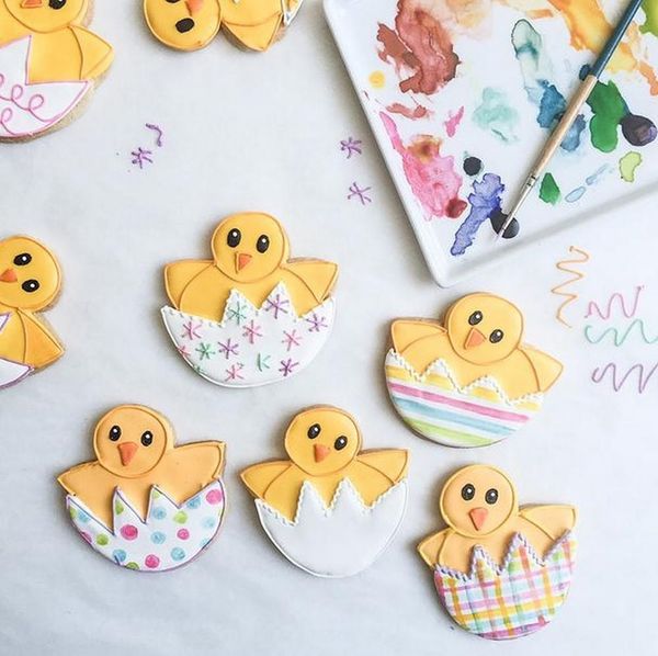 To decorate, use royal icing the consistency of toothpaste to outline the edges of the chick in yellow and the egg in white. Use a looser version of each icing to fill in the shapes, and allow the icing to set. Don’t forget black icing with a white dot for the eyes and orange for the beak. Then, go to town! Use a small paint brush or icing from a tube to create springy patterns, or leave the eggshell white to recreate the original emoji.