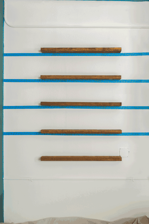 We began with a white wall and wooden shelves, and primed the shelves to start the process. Then we taped off lines to create bands of color. We chose to create a seamless set of stripes, which means painting in stages to avoid leaving any white sections. We started with the top section, the middle section, and the bottom. We painted those colors and waited for them to dry. Then we moved the tape to overlap with the top and bottom edges of each color, and painted our other two sections. Easy as… 1-2-3-4-5 ;)