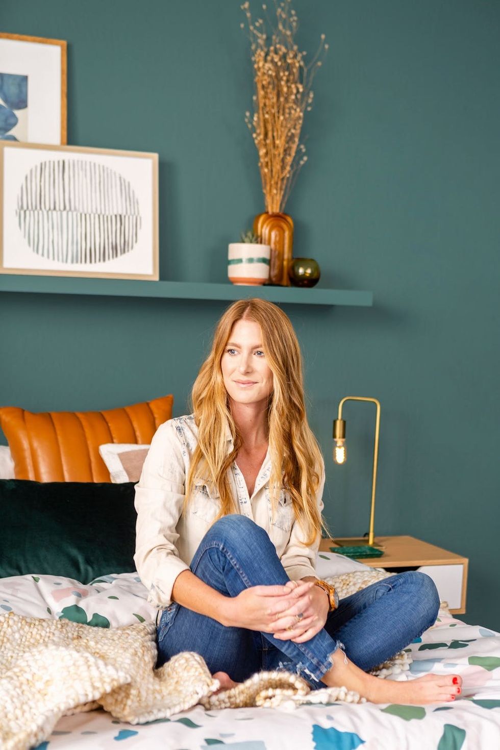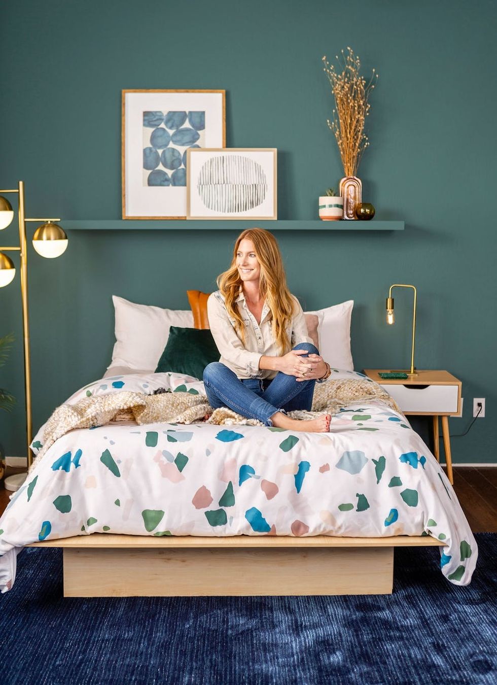 We started out with a blank canvas and layered in coordinating colors. When considering the vibe we wanted this room to personify, we knew we wanted to include shelving for art objects and tchotchkes found while traveling, and to bring a bit of brightness to the room with airy artwork above the bed.