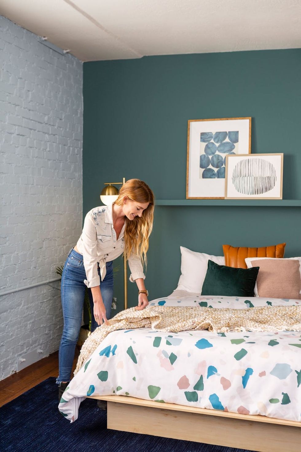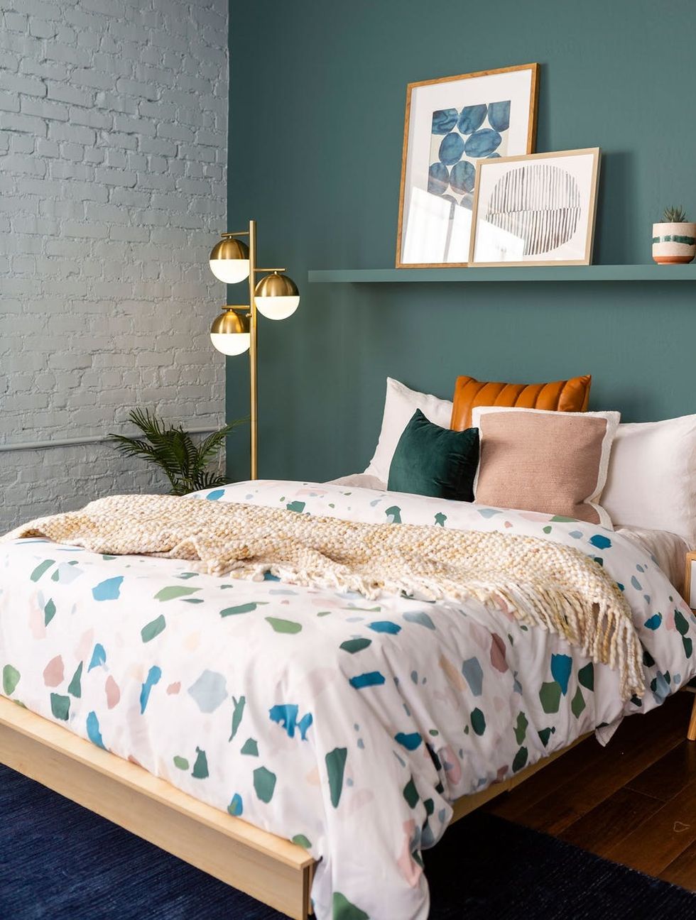 For bedding, we wanted to bring lighter tones in the room, so we opted for a pale wood platform bed topped with this fun terrazzo bedding and mismatched accent pillows. We installed a shelf above the bed and painted it to match the wall to create a seamless, floating effect.
