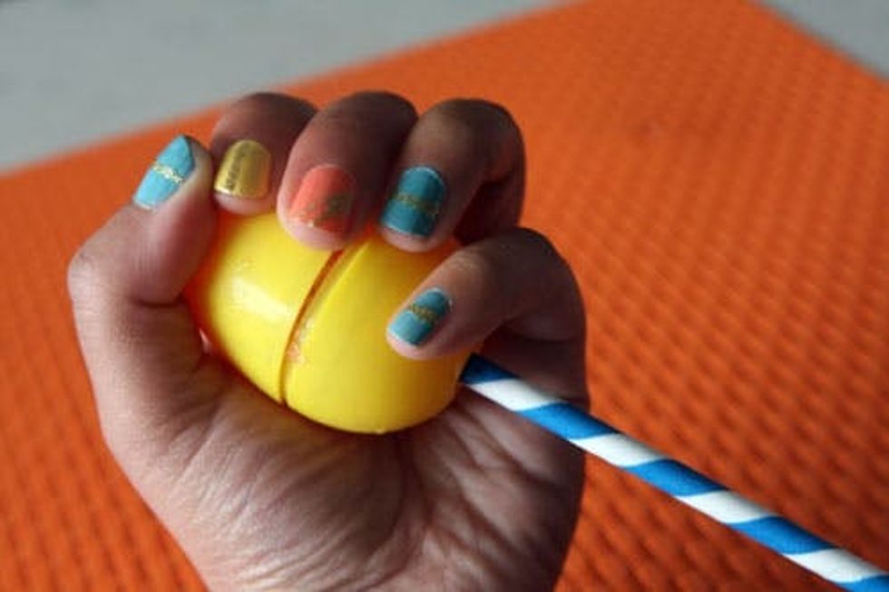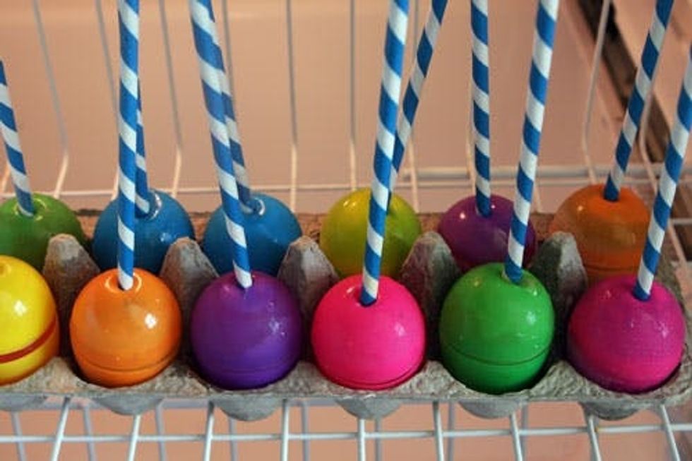 Pour any kind of drink in through the hole. We recommend pouring over the sink, but you can also place in an egg cup. Once your egg is a little less than full, place in an egg carton, hole-side up. Place a straw or popsicle stick in the hole.