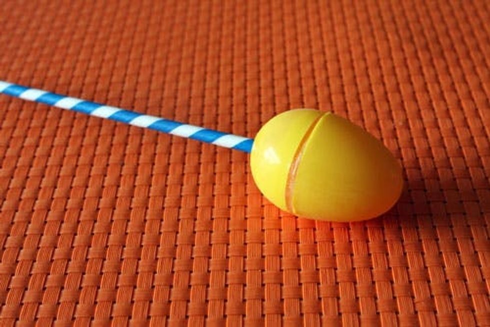 Take the bottom half of your egg and place it so the flat edge is on your work surface. Use a push pin to poke a hole in the center, and two on the side. The two side-holes are to provide air circulation when you’re pouring in your Vitamin Water or Gatorade.