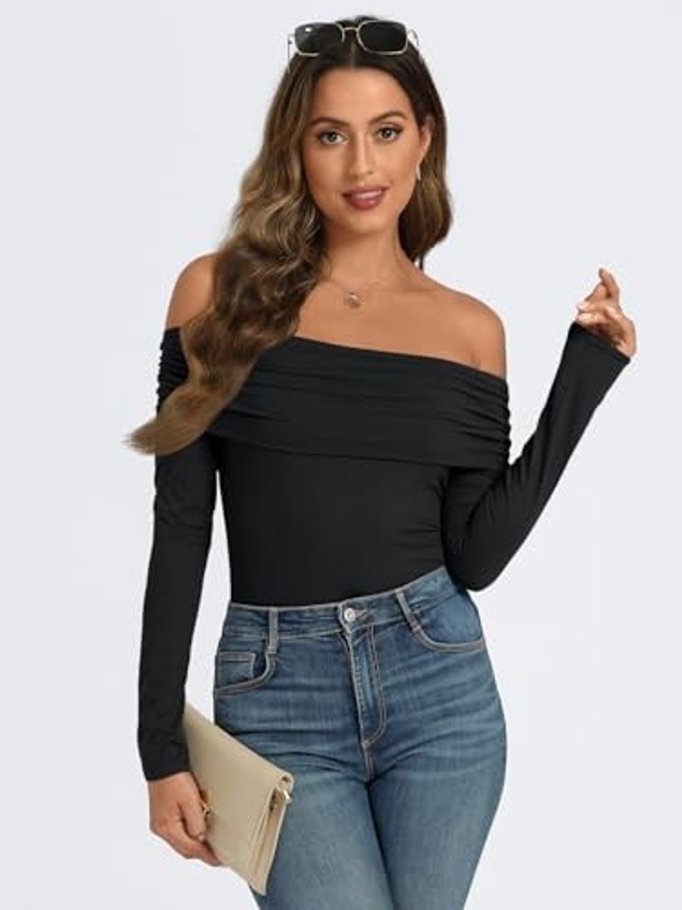 Fancy up your everyday looks with an off-the-shoulder top. This style offers a feminine neckline that allows you to accessorize with your favorite necklaces.