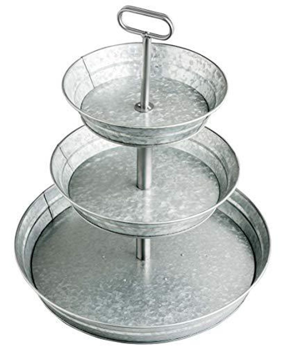 A fun way to let people serve themselves at brunch or dessert time is a hot cocoa bar so they can dress up their own concoctions. This three tiered stand in rustic galvanized metal provides an attractive, compact way to corral all the fixins! You can also use it as a coffee bar, a dessert tower, or even to hold your fruit on the daily.