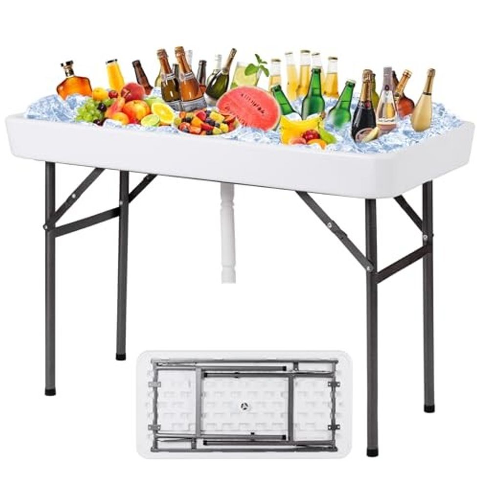 Graduate from a regular cooler to this cooler table. You'll have an added sense of style, and guests will easily see where the drinks are. The table can hold up to 440 pounds, and the legs can be folded for easy carrying.