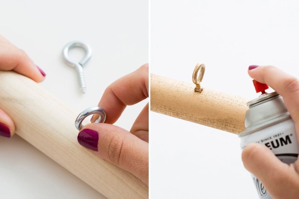 Screw in your hooks into opposite ends of the wooden rod and then spray paint to make it uniform. We chose gold! (Duh!)