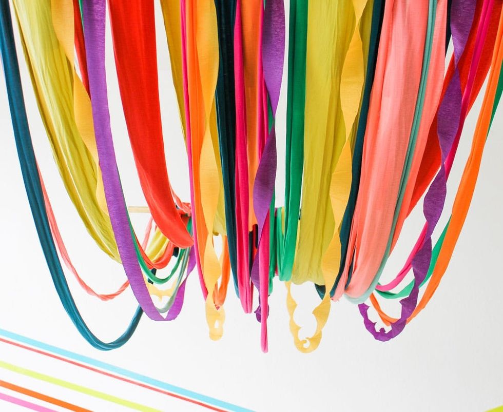 Time to talk about fabric. We used tons of brightly colored jersey fabric. Each strip was about 5 inches wide and 8 feet long. Don’t worry, you do not need that much. You can just create a smaller fabric chandelier. If you are on a budget, try cutting strips of old t-shirts to hang on your chandelier. A bucket of dye can turn those babies into beautiful brightly colored strips.