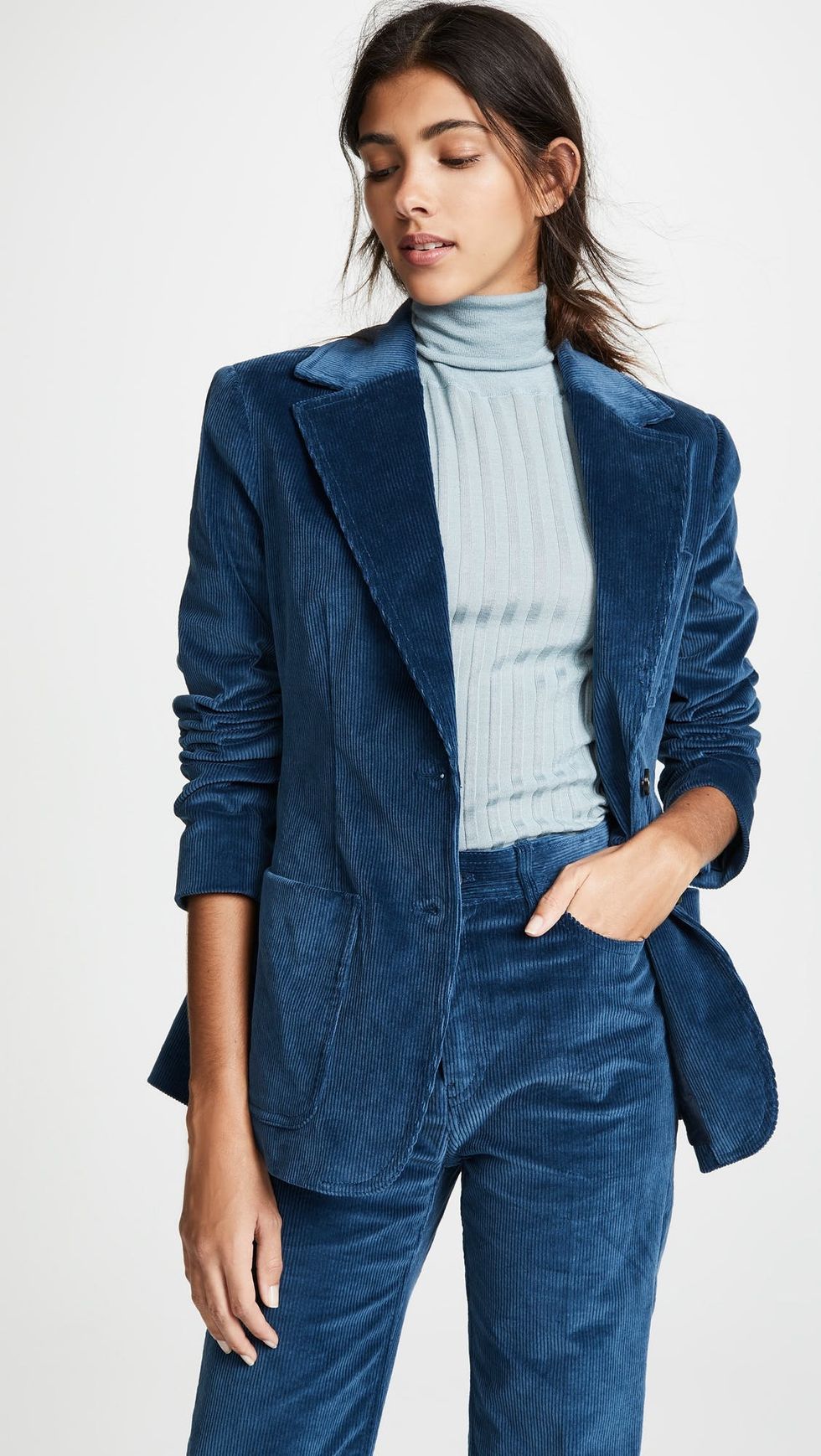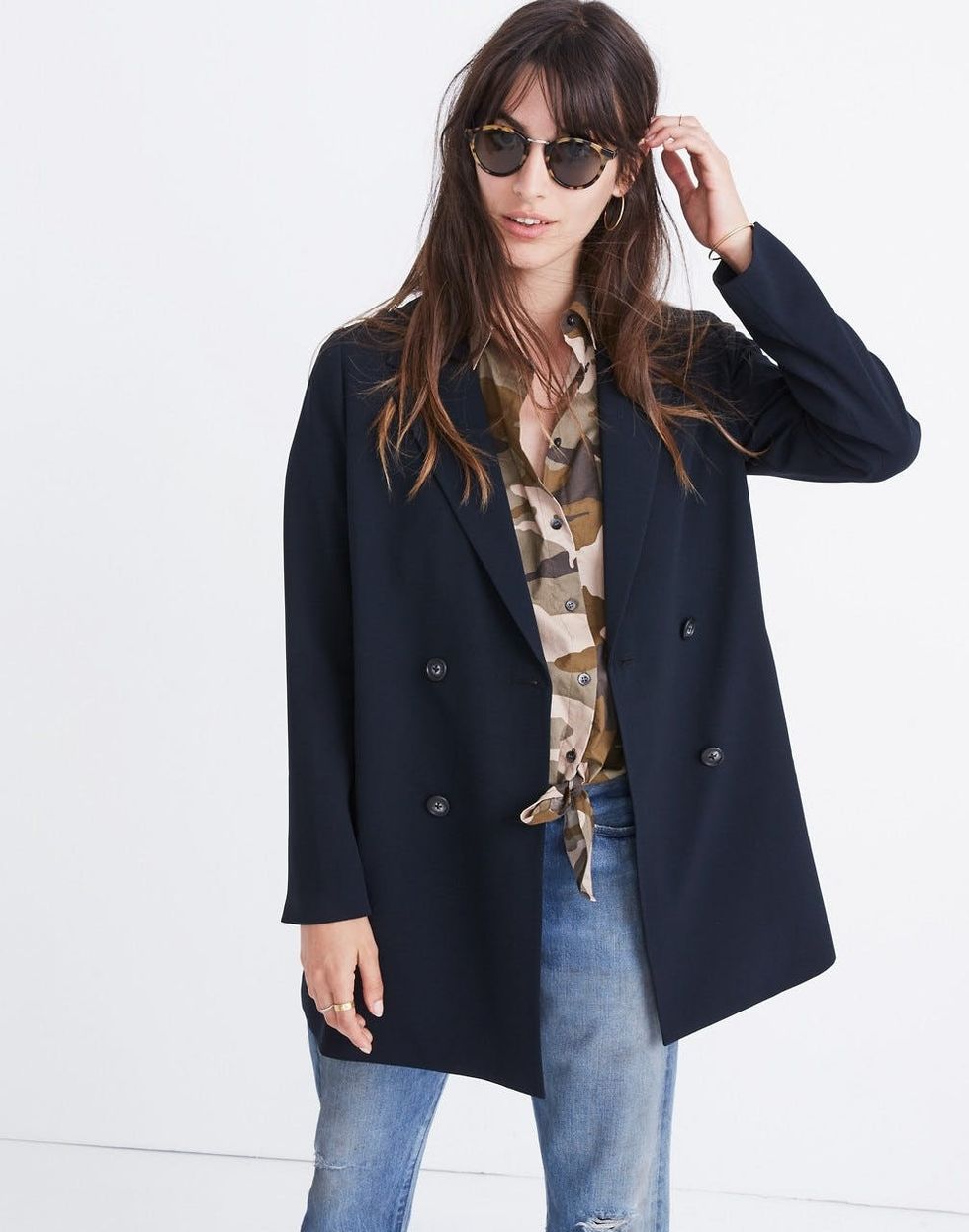 One thing we love about fall: It's officially layering season. With so many outerwear options to wear, our outfits become that much more interesting — it's just too bad we don't get to wear them inside. Or do we? A blazer doesn't just add a tailored finishing touch to your look; it can also double as a jacket during the milder weather. The key is looking for styles in richer, more substantial fabrications. Whether you're wearing a graphic tee, a turtleneck, or a floaty midi dress, any of the stylish options ahead would definitely fit the bill.