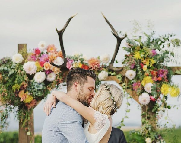 9. Antler Arbor: Keep things vibrant with pops of yellow, pink and red in the floral arrangement and add a rustic fall touch with a pair of antlers at the center of the backdrop. (via Style Me Pretty)