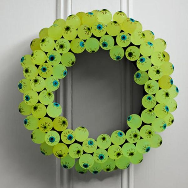 8. Eyeball Wreath: If your front door gets full sun all day, this is the wreath for you. Each of the bouncy ball eyeballs glows in the dark. Trick-0r-treaters will be greeted by a group of ghoulish glowing eyes. Creepy! (via Country Living)