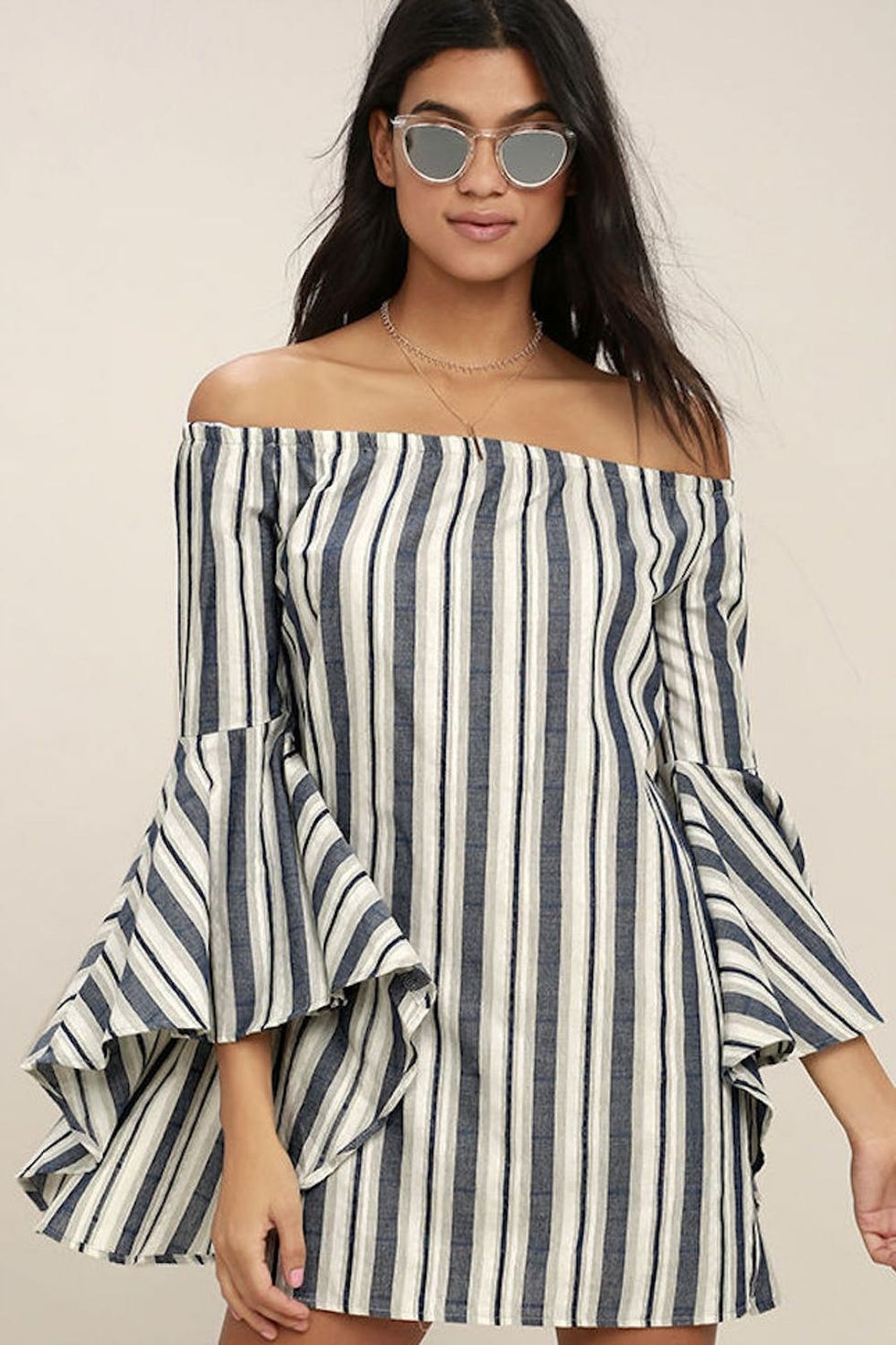 10. This adorable Lulu’s Along the Tides Navy Blue Striped Off-the-Shoulder Dress ($48) will get through the end of summer and the beginning of fall. Just switch out your sandals for ankle boots et voila! Transitional dressing made easy.