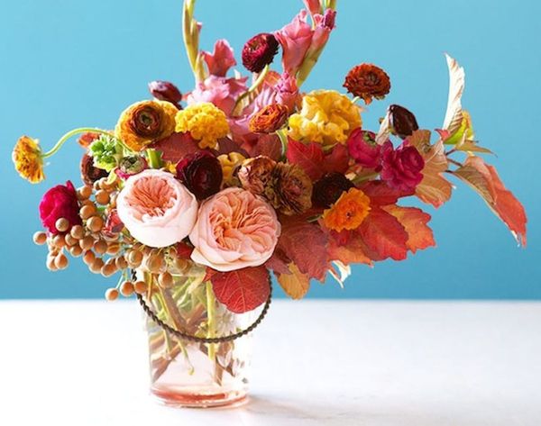 We can’t help it. Autumn is one of our favorite seasons. We love everything about fall, from pumpkins and bold colors to cozy sweaters and hot drinks. Fall flowers are all about warm colors like burnt orange, reds and fuchsia, as well as bringing in more unusual natural elements like branches, leaves, feathers and even fruits and veggies. Whether you’re planning a fall wedding or just looking for ideas for your Thanksgiving dinner table, we’ve got 19 unique flower arrangements to inspire you.