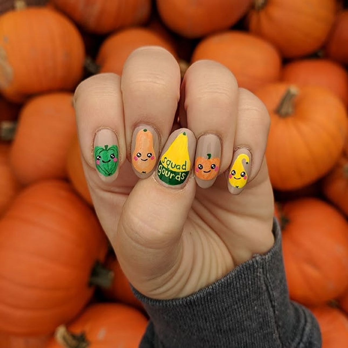 Pump Up the Pumpkin: While we typically see pumpkin nails in the form of jack-o'-lanterns, these small squashes serve as a festive substitute to the classic half-moon manicure. (via @mikkismanis)