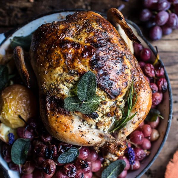 A roast chicken can be super simple or incredibly decadent. This one gets a layer of goat cheese, walnuts, and herbs stuffed under the skin, sits atop a bed of grapes, and bastes in apple cider. You might want to make this showstopper an annual tradition. (via Half Baked Harvest)