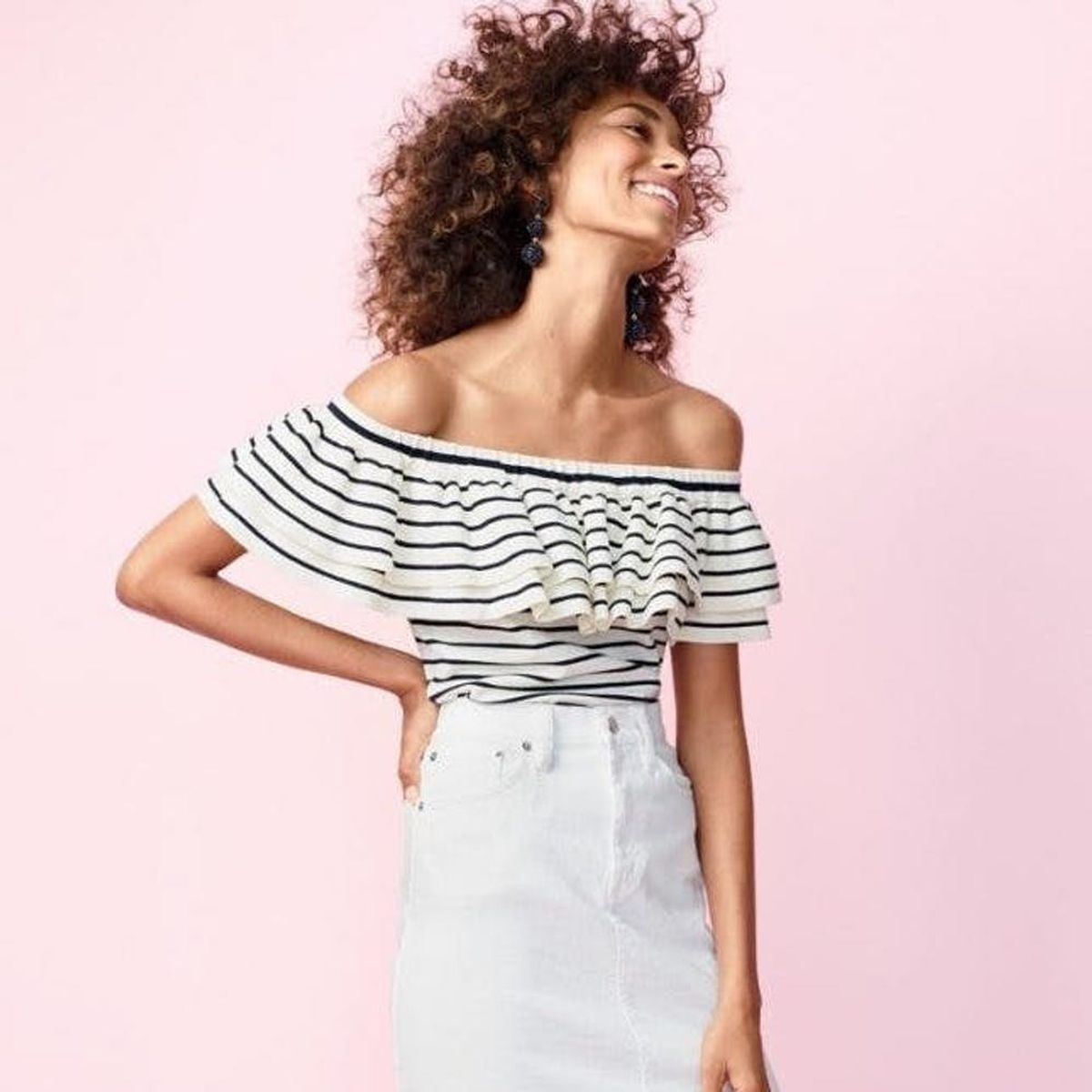 4. J.Crew: You’ve got to give J.Crew cred where it’s due (they are the innovators behind National Stripes Day, after all). Season after season, they’re known for their arsenal of timeless stripe staples, as well as delightfully unexpected plays on all your beloved classics. Exhibit A: Check out dem frilly gingham sleeves — we’re sold. Brit + Co Pick: J.Crew Lightweight Striped Off-the-Shoulder Sweater ($90)