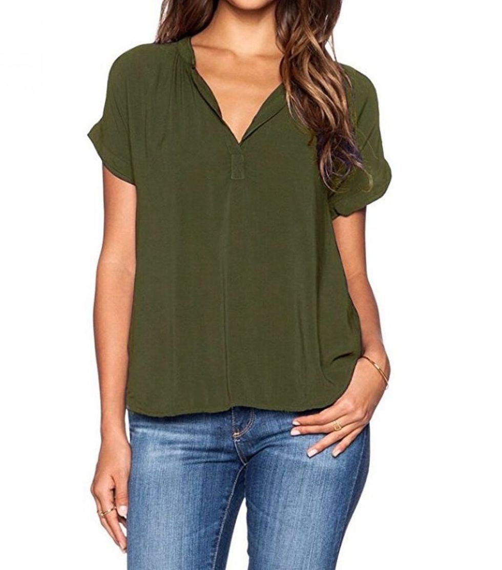 LILBETTER Chiffon Blouse V Neck Short Sleeve Blouse ($15) will become your go-to breezy blouse for the office and life on the weekend.