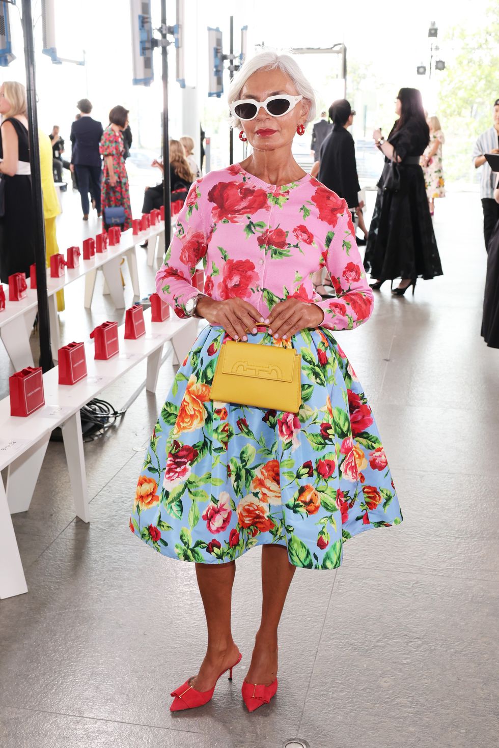The fashion calendar works six months ahead, meaning that all the spring collections are on display during the the fall shows in September. Grace Ghanem (one of our fave granfluencers) dressed in a lively spring print with pops of colorful accessories, closely mirroring what's on the runway.