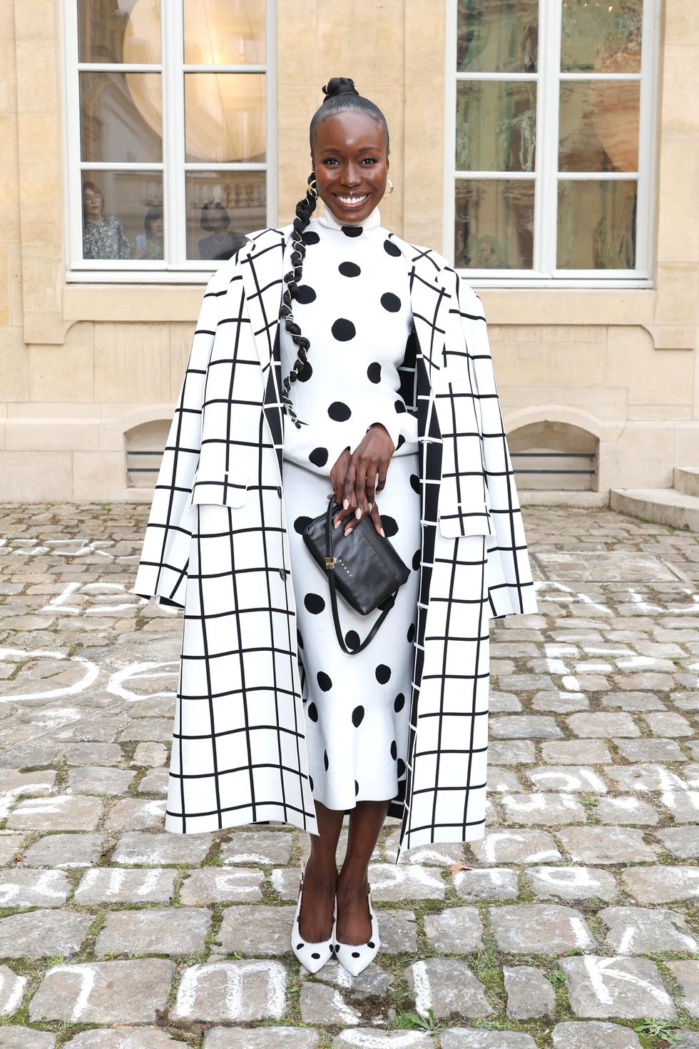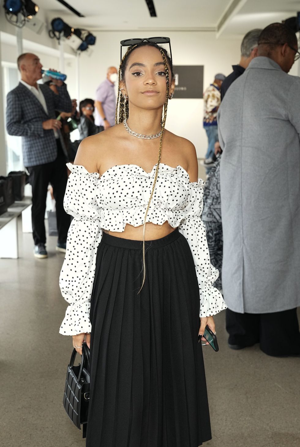 There's a fine line between stylish and kitsch, and this showgoer keeps things chic with just the right amount of ruffles and bow details. The monochrome definitely helps, too!
