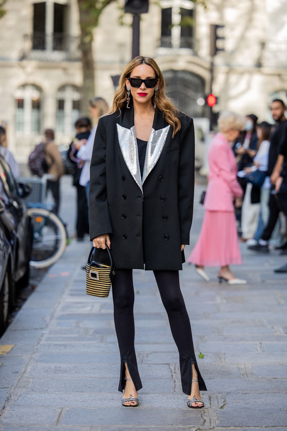 We love an office-friendly look! This showgoer keeps her all-black fit interesting by playing with proportions. Start with a sleek pair of pants and top off with an oversized jacket. Bonus points for slitted flairs and metallic lapels!