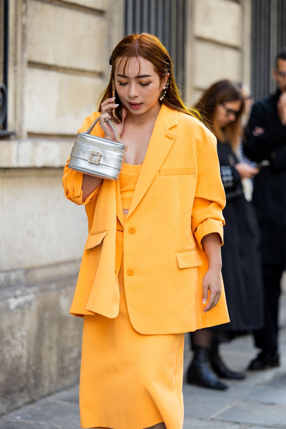 Another shining example of monochrome done right! The skirt suit is unexpected, but the glowing tangerine shade truly brings it to life.