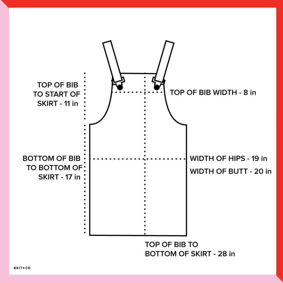 First, draft your pattern. Measure the width of the bib, from the top of the bib to the start of the skirt, from the top of the bib to the bottom of the skirt, and the width of your hips. Above is a diagram of everything you need to measure. You want to be generous with your measurements, because it's better to overestimate than underestimate when measuring fabric. Below are my measurements.