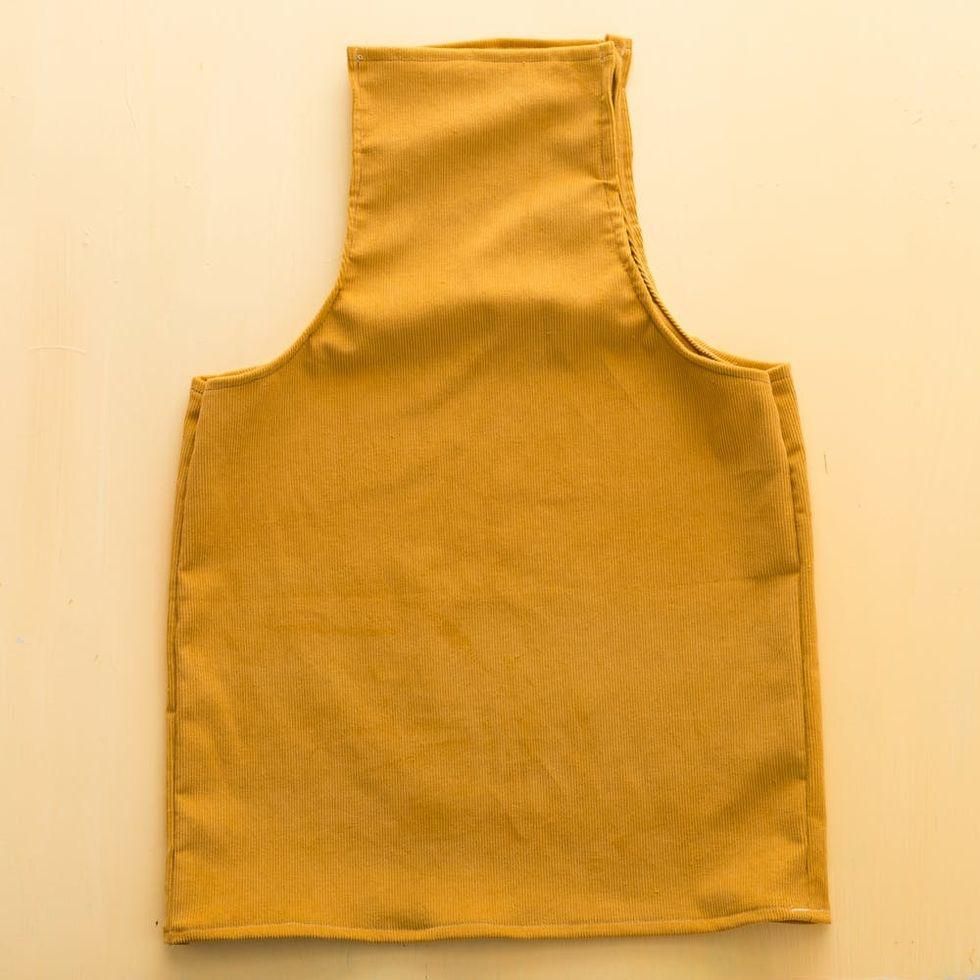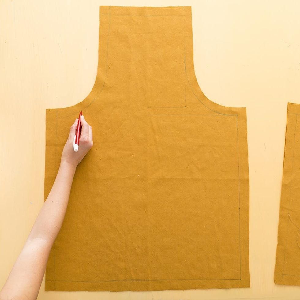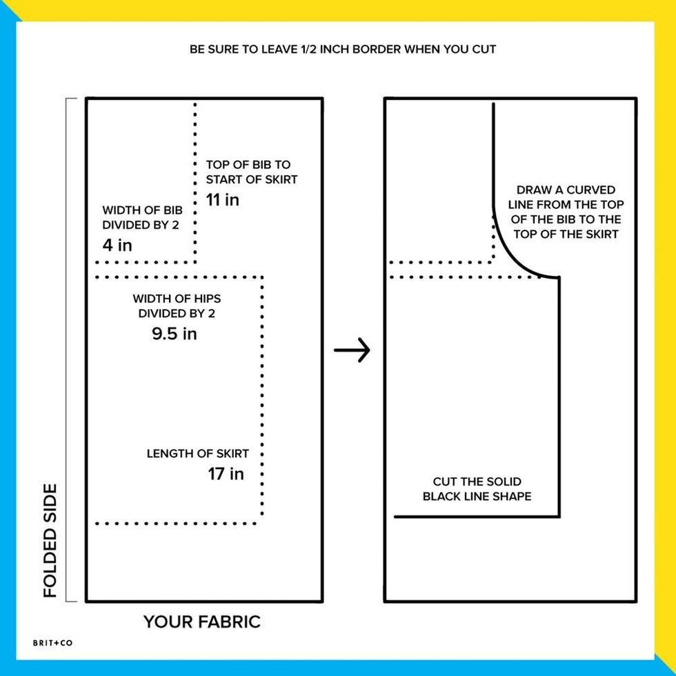 Draw a curved line from the middle of the bib to the top right corner of the skirt rectangle. This is the shape you want to cut out. Cut out the shape, but leave at least half an inch around the outline for easier sewing.