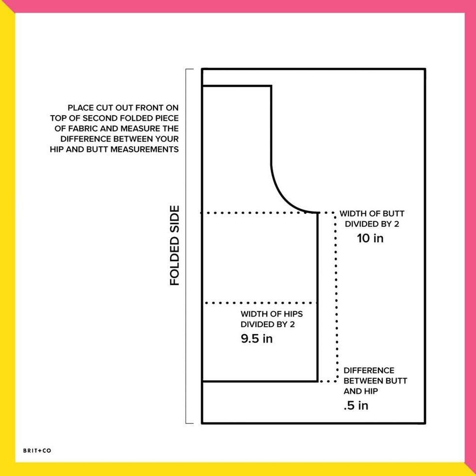 Place the shape on top of another folded piece of fabric, folded sides together. Trace the shape on the fabric. Measure the difference of your butt measurement to the width of the skirt part. For example, my butt measurement is 20 inches, so divided by two is 10 inches. 10 minus 9 ½ (my hip width divided by two) is ½ inches. See my diagram for reference. Cut the second shape out, leaving at least half an inch around the outline.