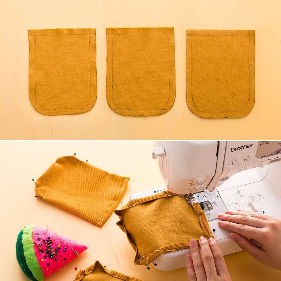 Sew a pocket by cutting out three pocket shapes and hemming the top edge. My side pockets are six inches wide and seven inches long.